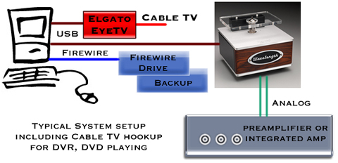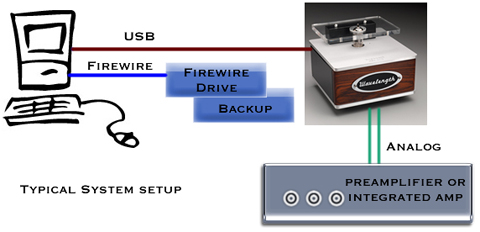A typical setup for a USB DAC system is shown above. We have two Firewire disks for our library (one is for backup). We use Firewire over USB drives because we don't want to overload the USB link. The output of the DAC is fed to a preamplifier or integrated amplifier and then to the amp and speakers. There are several suggestions for full remote control located on the setup pages for Macintosh and Windows.