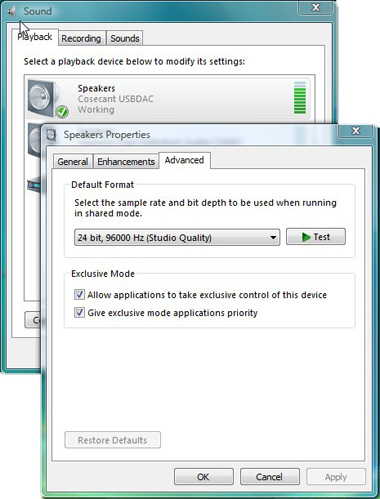 You may want to set the Sounds panel to no theme so that computer sounds will not go through your stereo system. If you are using a 24 bit DAC you can also set the default output sampling rate. Select the Cosecant or your dac and then do Configure and the Speaker Properties window will come up. Under Enhancements make sure all the enhancements are disabled. You can then goto the Advanced pane and select your output sampling rate for the system.